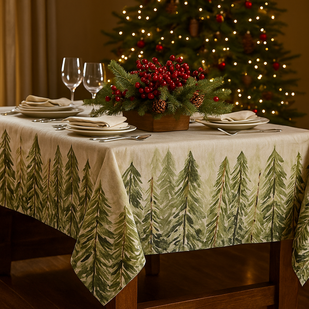 Simple Day Christmas Tablecloth with Fir Trees 160x260 cm in Linen