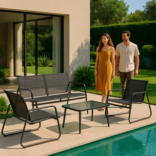 The Gonzalo Anthracite 4-piece living room set is the perfect choice for those who want to furnish outdoor spaces with a touch of elegance and functionality. Its structure in steel treated for outdoor use by phosphating and powder coated (polyester) makes it resistant to atmospheric agents, guaranteeing a long life over time without sacrificing style.