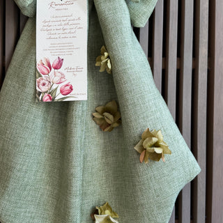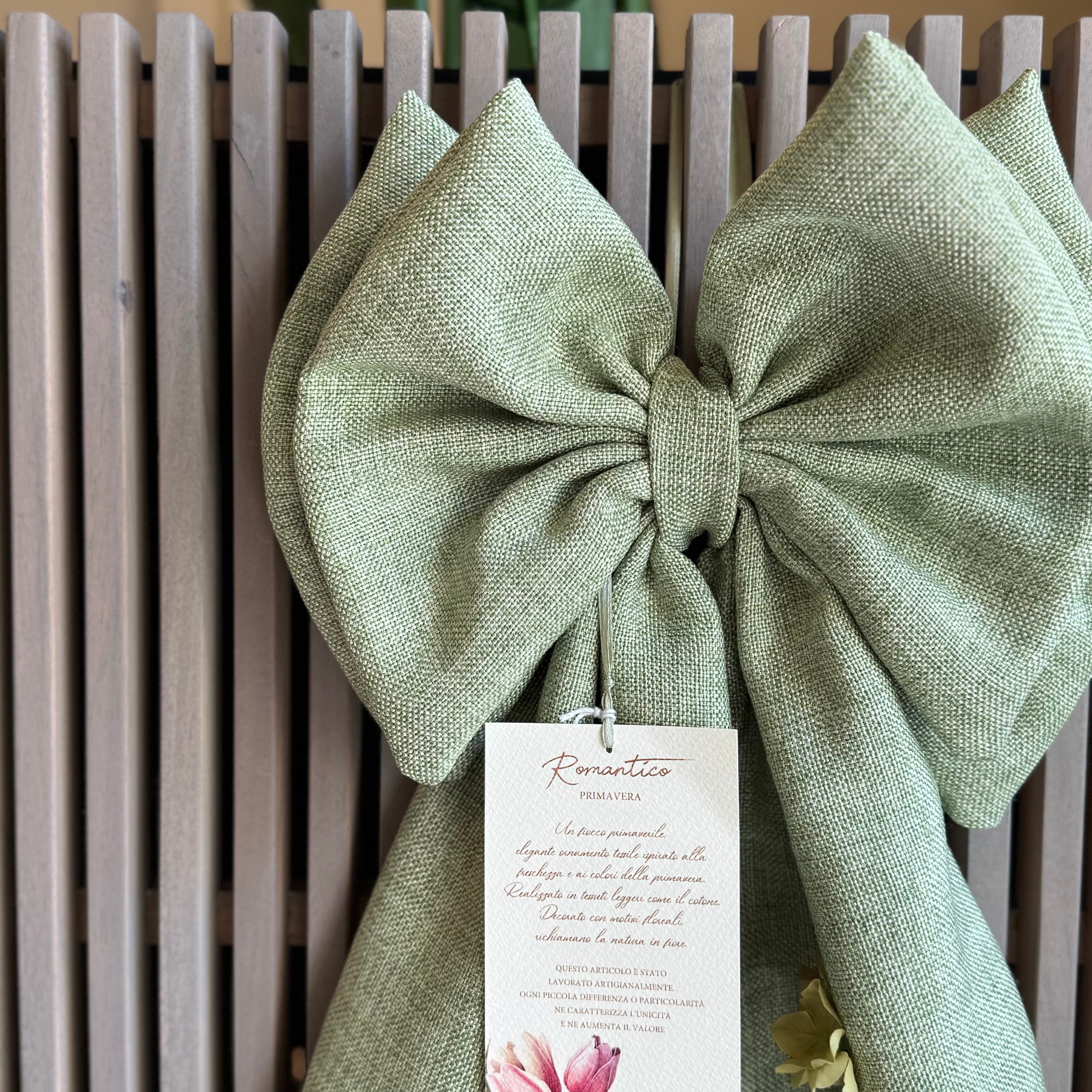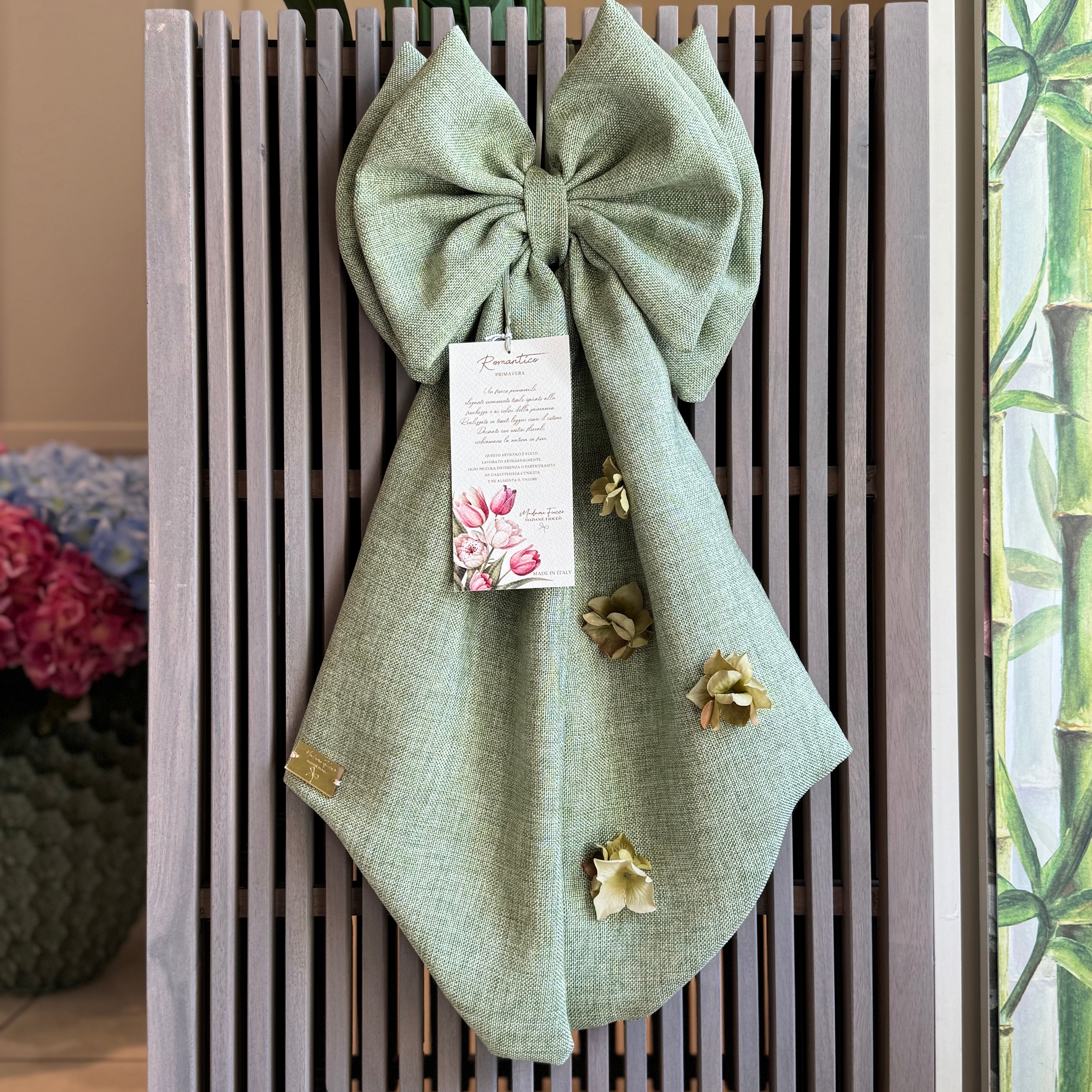 Discover the Spring Bow Madame Bow Outside the Door in Green Piquet H65 , an exclusive decoration handmade in Italy. This elegant bow, made of high quality green piquet , is ideal for decorating your outside the door or any other corner of your home. Its refined design and fresh and natural shade bring a touch of class and freshness, perfect for welcoming spring in style.