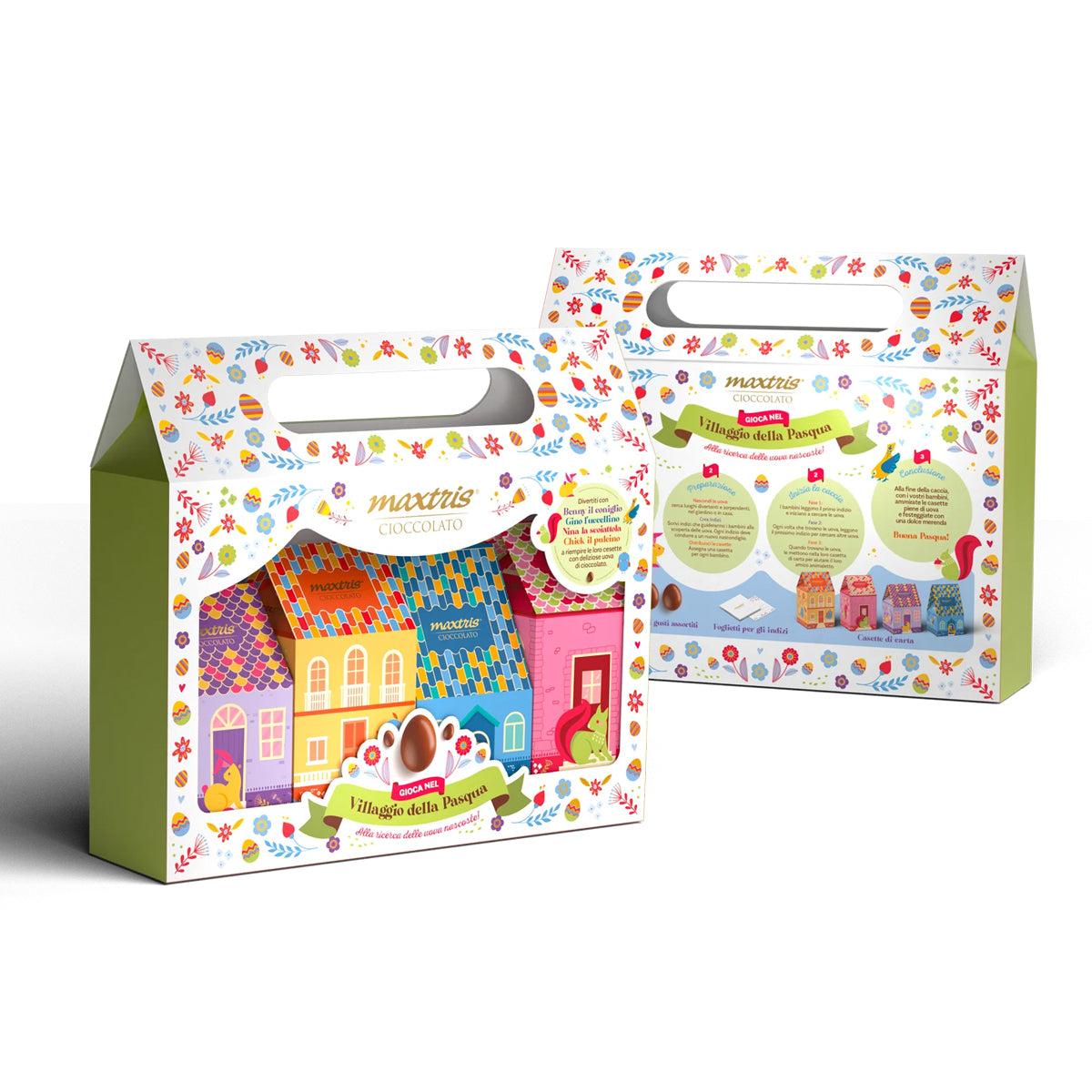 Bring the magic of Easter to the table with the Maxtris Easter Village! A special suitcase containing four colorful houses filled with delicious assorted Maxtris chocolate eggs. But it's not just a dessert: it's a real game that will make Easter even more fun for children!