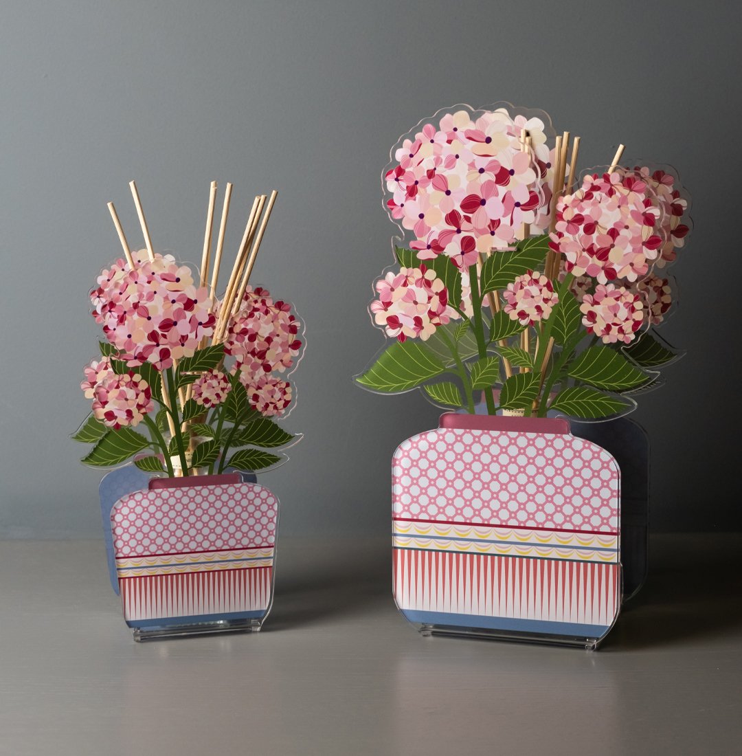 Discover Aurora , the 100 ml air freshener by Vesta , designed for those who want to combine elegance, fragrance and design in a single object. This refined home diffuser is made of fine acrylic crystal and stands out for its delicate shape of a blooming hydrangea, a symbol of harmony and beauty. With Aurora , Vesta transforms every room into a welcoming and stylish space, where every detail is taken care of to offer a unique sensory experience.