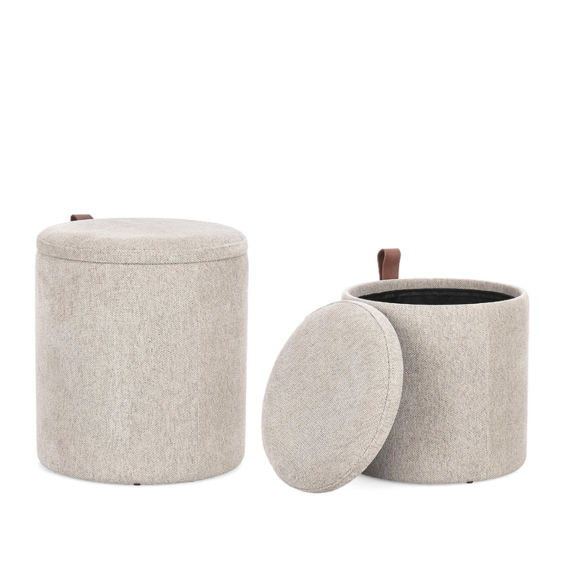 Con un’imbottitura a densità 30 kg/m³, assicurano una seduta confortevole, ideale per momenti di relax o per accogliere ospiti. Il pratico spazio contenitivo interno permette di riporre plaid, libri, giochi o altri oggetti, aiutando a mantenere l’ordine senza rinunciare allo stile. Il dettaglio della maniglia decorativa in similpelle aggiunge un tocco sofisticato e facilita lo spostamento dei pouf.
