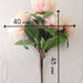 Il gambo del mazzo è realizzato in materiale sintetico colore verde scuro, come le foglie che compongono il bouquet ed ogni peonia può essere recisa dal mazzo per essere utilizzata in altri ambienti. Il bouquet ha una dimensione di circa 40 cm di diametro con una lunghezza di circa 48 cm.
