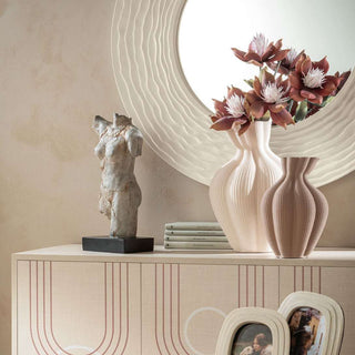 Realizzato in porcellana di alta qualità, combina linee armoniose e un design sofisticato, ideale sia per esporre fiori freschi e secchi che come elemento decorativo da solo. Grazie alla sua forma bassa e compatta, si adatta perfettamente a tavoli, mensole e consolle, donando personalità agli spazi.