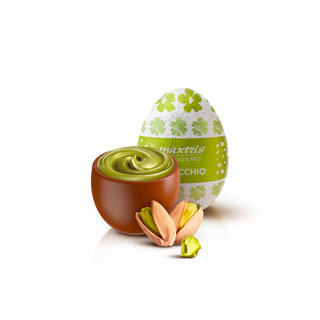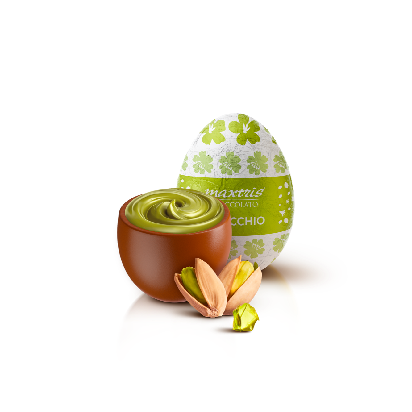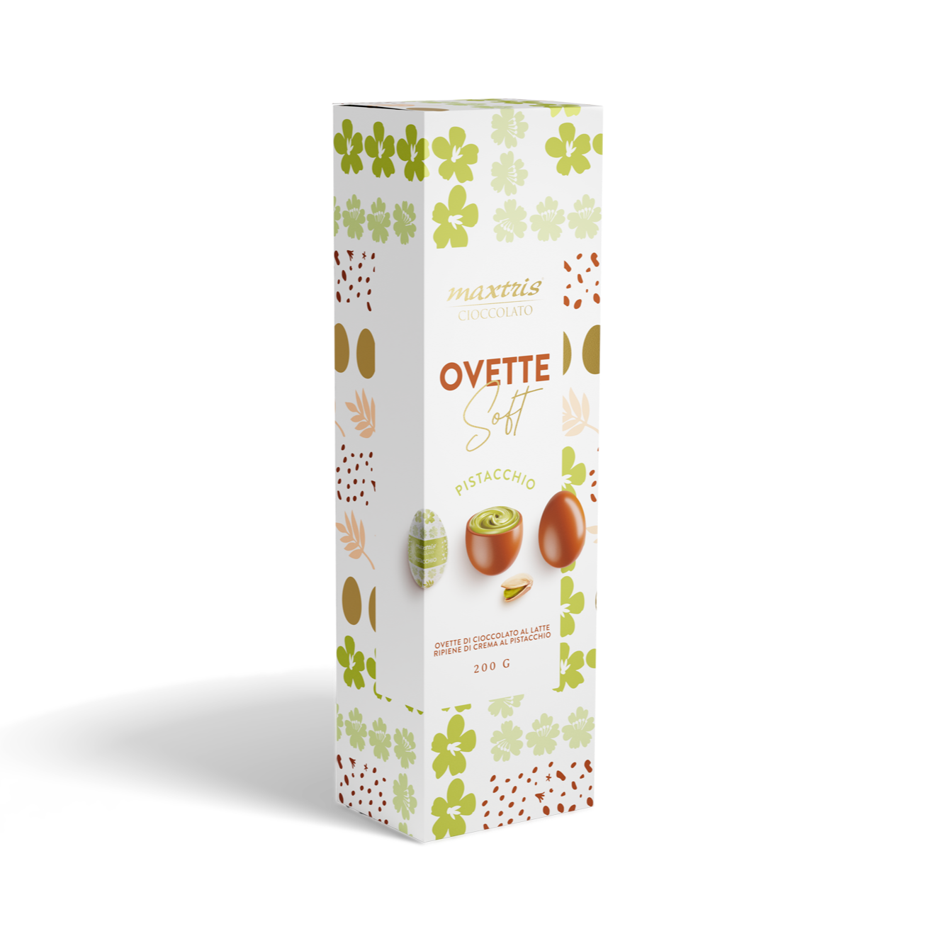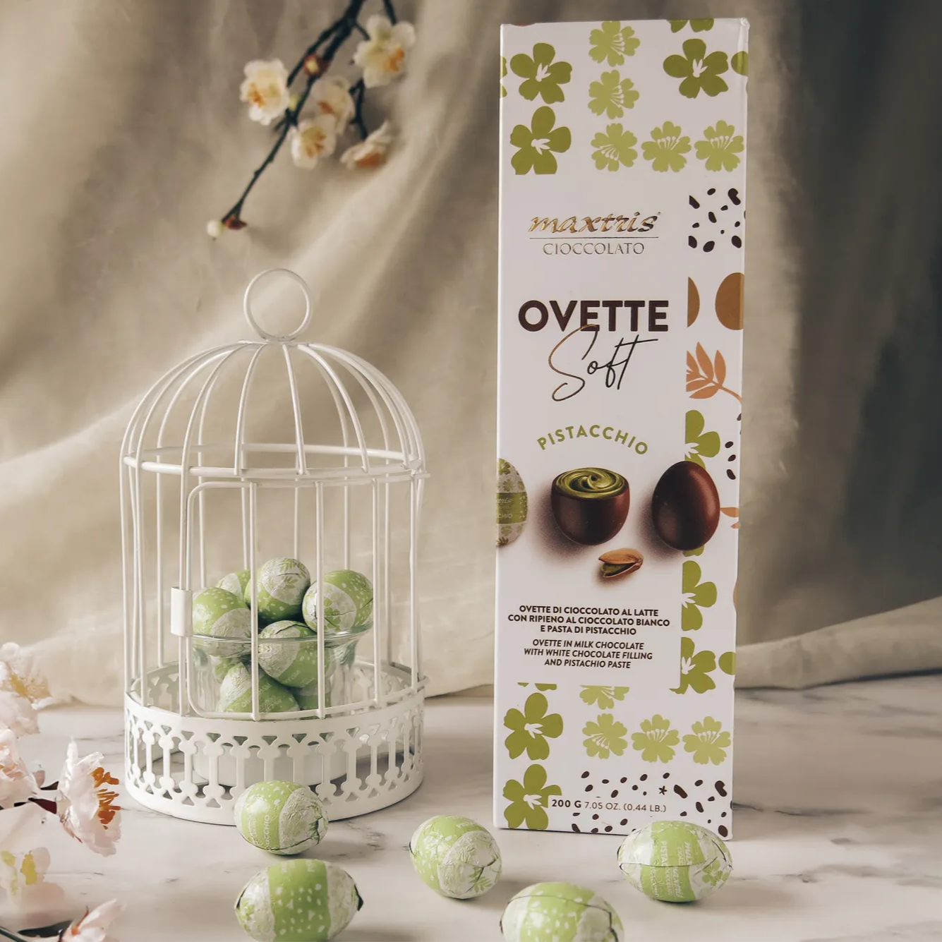 Ogni ovetta, confezionata singolarmente nella stagnola, offre un guscio di cioccolato al latte che abbraccia un morbido ripieno al cioccolato bianco e pasta di pistacchio.