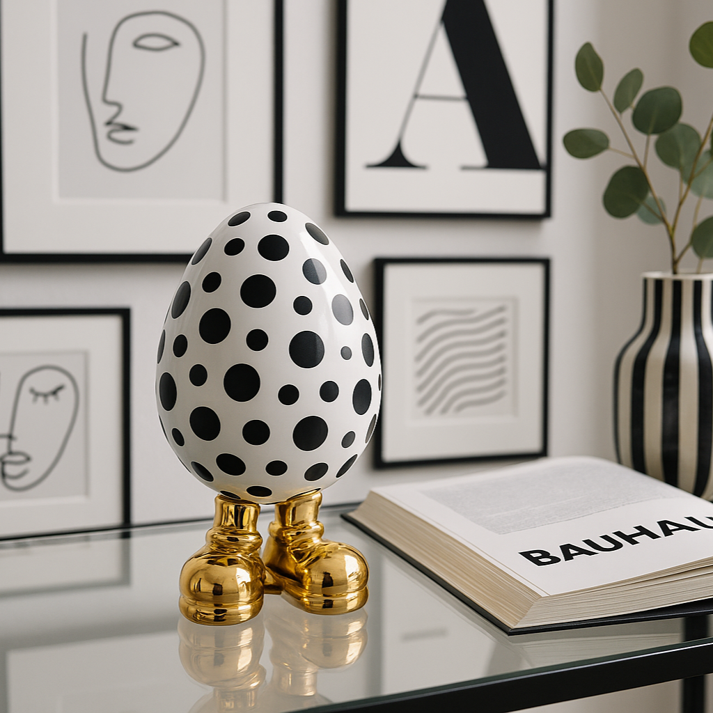 Un oggetto di design sorprendente e ironico: l’Uovo con Piedi di Mia Design, alto 28 cm, è una decorazione scultorea che unisce linee essenziali e dettagli pop. Realizzato in resina effetto marmo specchiato, con piedi dorati in stile cartoon, è perfetto per dare un tocco eclettico e originale alla tua casa o al tuo ufficio.