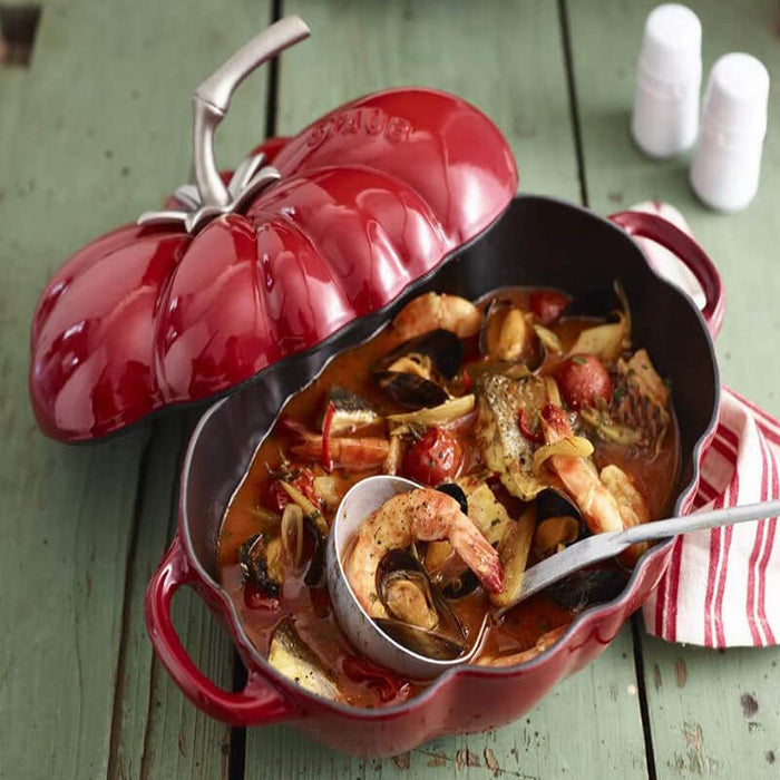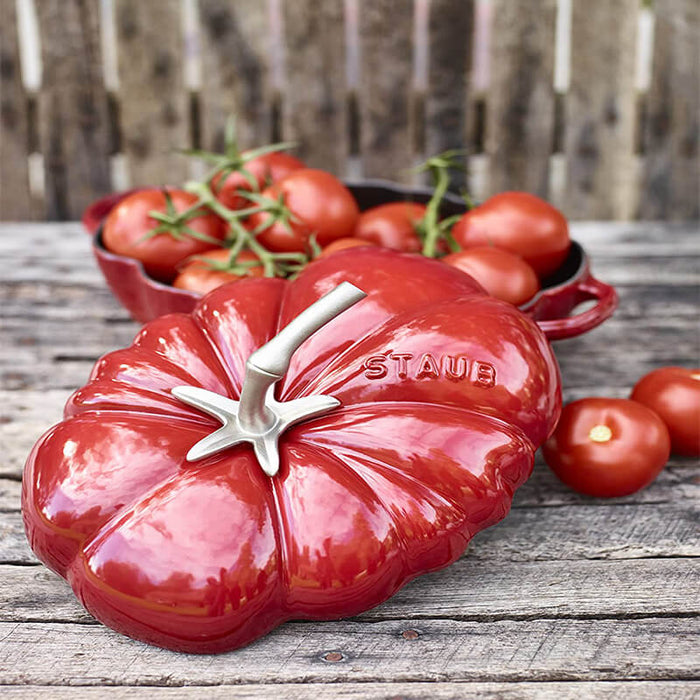 La cocotte Staub rosso ciliegia è consigliata a tutti i principianti, i cuochi amatoriali e professionisti che apprezzano il design bello e originale. Il suo aspetto ricorda quello di un grande e succoso pomodoro cuore di bue e cattura l'attenzione in cucina e sul tavolo da pranzo. Questa Cocotte ha un diametro di 25 cm e contiene 2,9 litri. Come tutte le cocotte Staub, è fatta di ghisa ed è quindi perfetta per creare tante ricette diverse. Non si usura ed è anti-graffio. Con la cocotte “Pomodoro” rosso ciliegia di Staub potrete creare nuove deliziose ricette e coccolare parenti e amici.