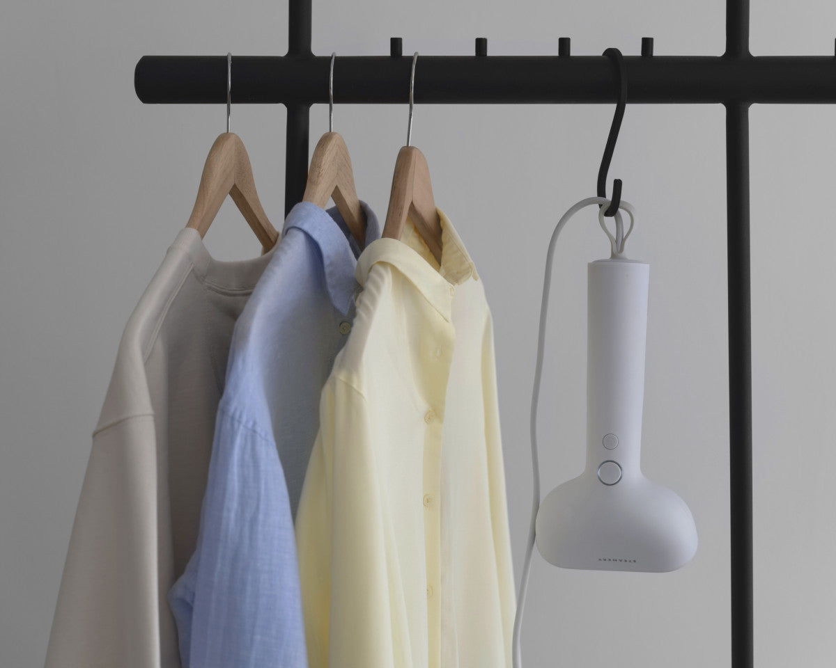Non avrai bisogno di un'asse da stiro per stirare a vapore: basta appendere gli indumenti a un appendiabiti, premere delicatamente il ferro da stiro a vapore portatile Cirrus X sul tessuto e iniziare a stirare.
