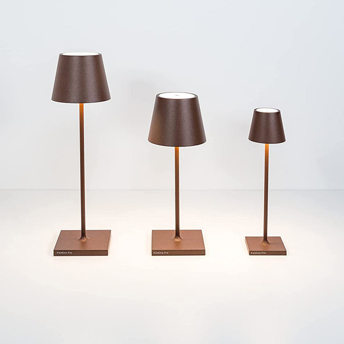 Lampade ricaricabili di Zafferano, collezione Poldina pro mini, con un corpo in alluminio verniciato, diffusore in policarbonato e fonte luminosa a LED. La collezione Poldina pro ha un grado di protezione IP65 che la rende adatta sia all’uso interno che esterno. La durata della batteria è garantita per più di 9 ore.